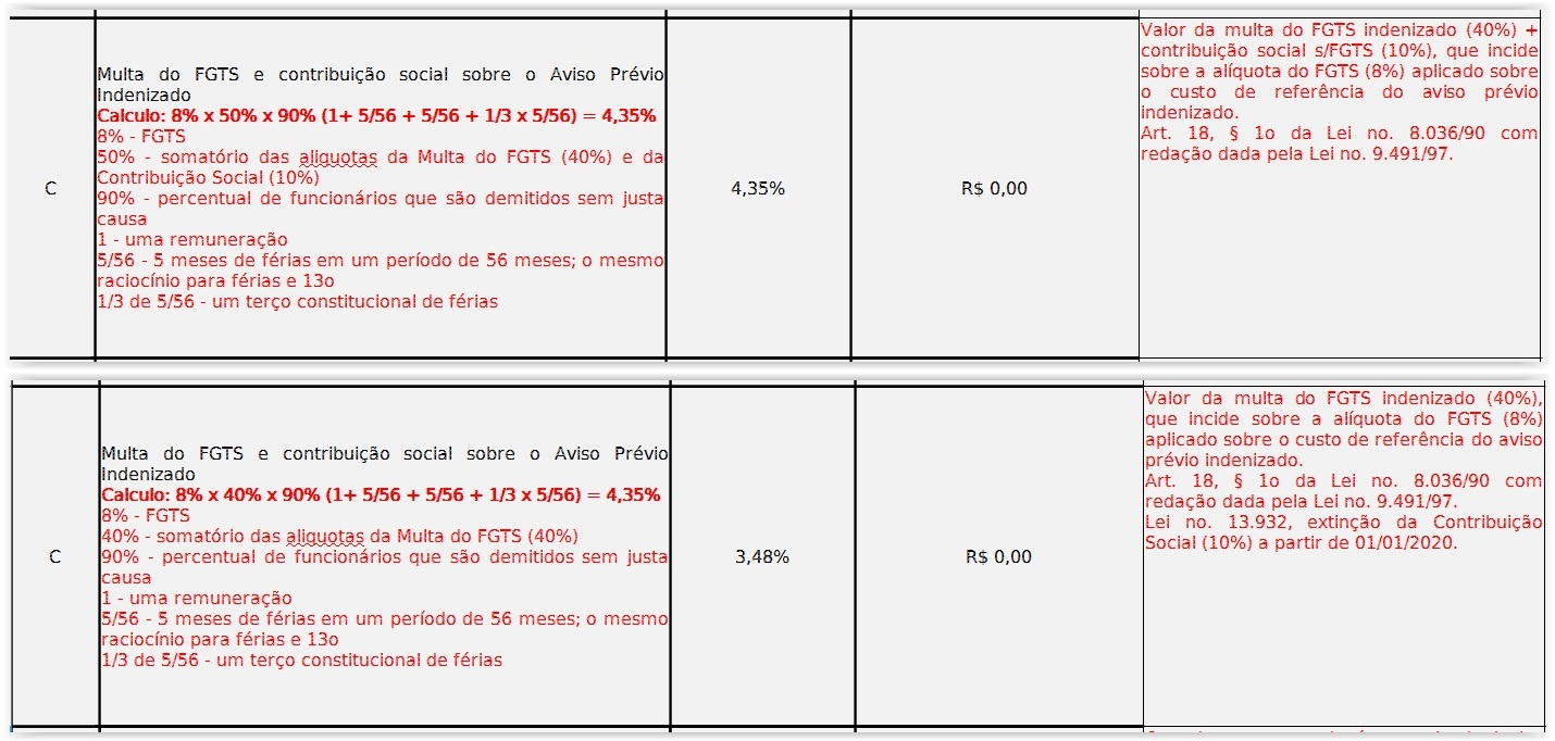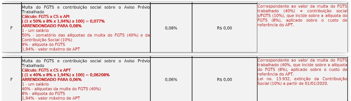 b) No caso da Conta-Depósito Vinculada - Bloqueada para Movimentação , apresentado no item 14 do Anexo XII da IN nº 5, de 2017, proceder a adequação de planilha de formação de preços, desde 1º de janeiro de 2020, referente à “Multa sobre FGTS e contribuição social sobre o aviso prévio indenizado e sobre o aviso prévio trabalhado”. O percentual que antes era de 5% (cinco por cento) passa a ser de 4% (quatro por cento).